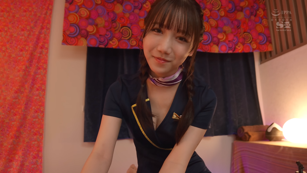 CA風のエステ制服で登場し、過度な露出はないものの、清楚感と非日常的な雰囲気が強いフェチを刺激する。